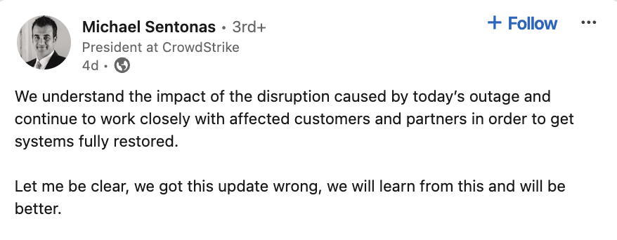 All eyes are on CrowdStrike over the next few weeks as they complete a root cause analysis and businesses recover and assess overall impact. CEO George Kurtz has been asked to testify in Congress, and it is likely that CrowdStrike will have to pay some fees and refunds. The company has been quick to accept responsibility for their role with senior leadership taking to LinkedIn to apologize.