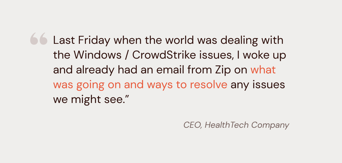 Zip Security worked with customers early Friday morning to get affected devices back online, closing out most active tickets by 2pm ET. Bitlocker keys managed by Zip were sent to system administrators and employees to ease remediation.