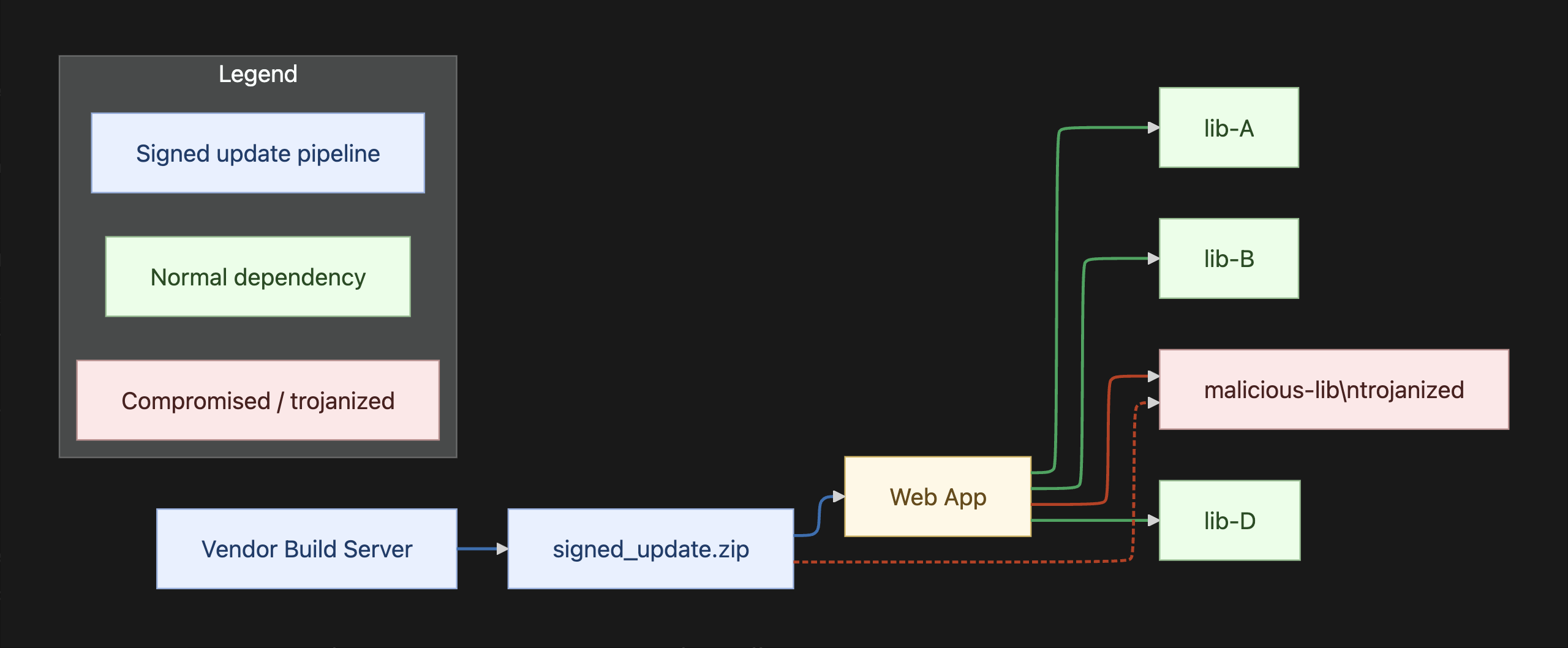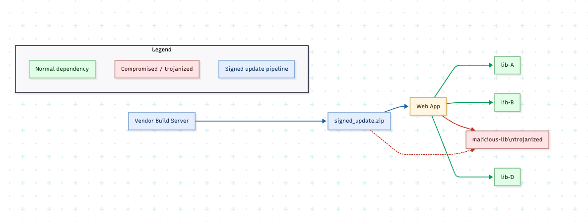 %% signed_update -.-> malicious-lib (trojan included)