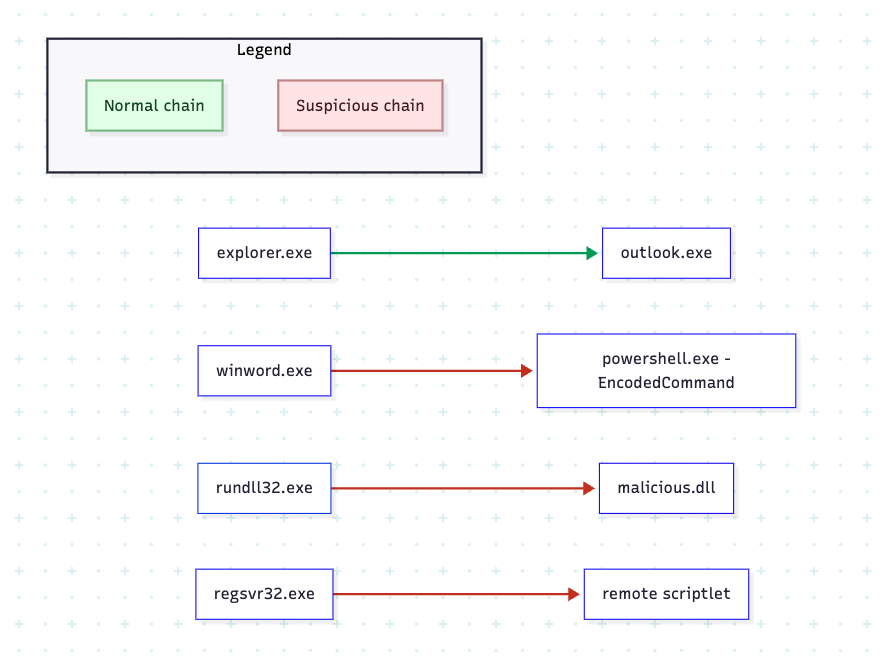 Every environment has a definition of “normal.” On endpoints, this means familiar parent-child process chains, like explorer.exe launching outlook.exe, versus unusual ones, such as winword.exe spawning powershell.exe. On networks, it means predictable flows between web servers and databases, rather than workstations reaching out to domain controllers. Even CPU, memory, and disk I/O follow repeatable patterns.