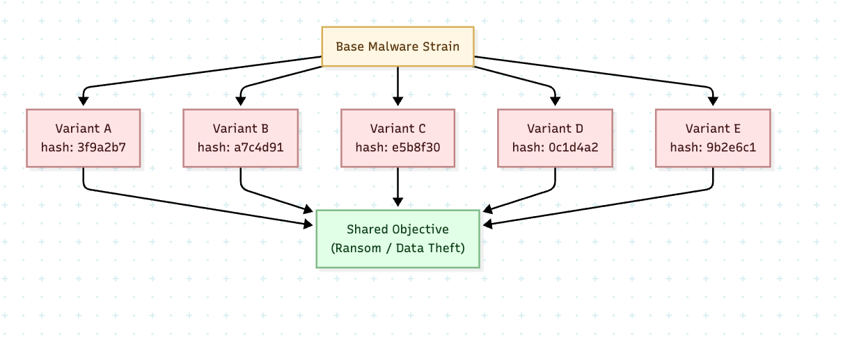 Polymorphic malware mutates constantly, but certain runtime behaviors remain stable across variants: